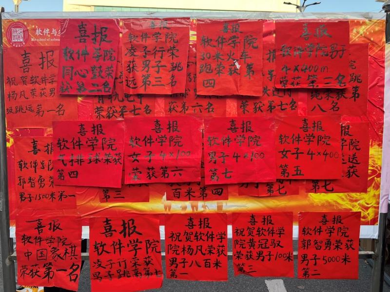 本届运动会,软件学子凭借各自的实力,奋勇争先,用智慧和汗水迎来一个又一个丰收和喜悦。经过三天不懈努力,软件学院田赛共获奖四项,径赛共获奖七项。其中男子三级跳远荣获第一、男子1500米、800米相继荣获第一、 男子5000米荣获第二、男子100米荣获第三……软件学院以辉煌的战绩,向众人完美诠释“文明其精神,野蛮其体魄”。