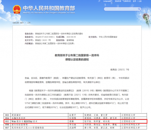近日,教育部公布了第二批国家级一流本科课程名单,软件与物联网工程学院聂鹏副教授负责的《Web服务与RESTful技术》课程成功入选国家级一流本科课程,这是软件与物联网工程学院在课程建设领域取得的又一重大突破!