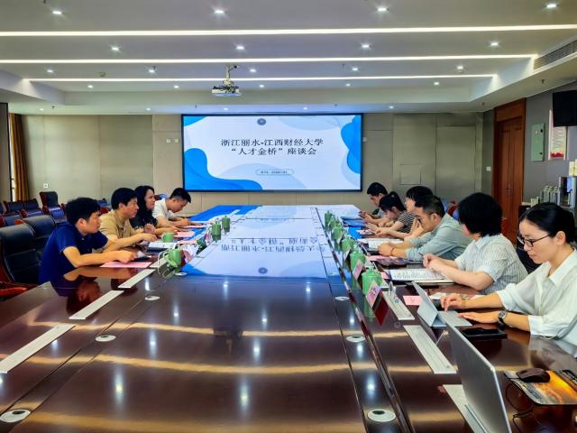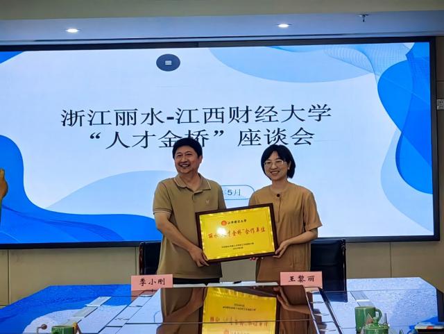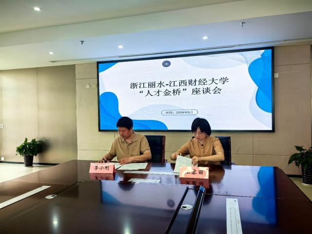 在丽水市人社局,季小刚、匡琳一行与市人社局人才管理服务中心主任王黎丽、副主任高磊,办公室主任叶慧莲,专业技术人员管理处干部王雯宇,莲都区人才中心主任叶俊飞,市人才科技发展有限公司副总经理叶学美等展开座谈。季小刚、匡琳从学校和学院的历史沿革、师资队伍、专业设置、招生就业、国际化办学、学科竞赛、校友工作等方面详细介绍了有关情况,他们强调就业是最大的民生工程,希望双方能够能进一步加强联系,鼓励更多毕业生赴丽水就业、实习。丽水市和莲都区人社相关负责人从产业生态、政策生态、平台生态、服务生态等方面详细介绍了丽水市和莲都区的人才政策、博士后政策,指出当前丽水正在布局的数字经济、半导体、新能源、健康等产业与江西财经大学学科建设、专业设置高度契合,丽水欢迎更多江财学子赴丽水就业创业,并将提供暖心热心的就业服务。双方还就人才引进、人才培养、合作交流等相关事宜进行深入洽谈。季小刚、王黎丽代表双方签订了合作协议书,丽水市委人才科技工作领导小组授予我校“丽水人才金桥合作单位”。