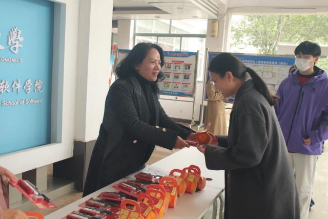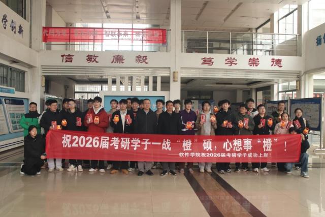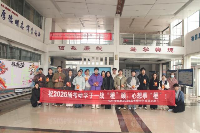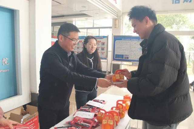 考研冲刺的号角已经吹响。为鼓舞2026届学子备考士气、缓解备考压力,12月12日中午,软件与物联网工程学院在荟庐一楼大厅温情举行了 “研途暖心加油包” 发放仪式。学院党委书记季小刚,副院长毛澄映、副书记匡琳、副院长罗远胜、汪靖以及学工老师共同到场,将这份满载心意的礼物递到正在全力备考的学子手中。
