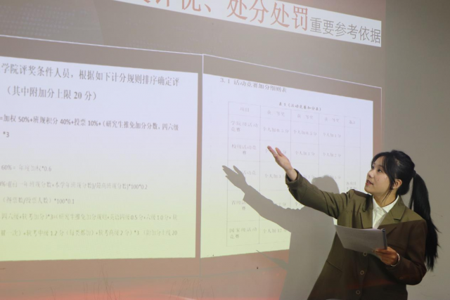 各班级代表通过PPT展示等形式,围绕学风建设、文体活动、志愿服务等维度呈现班级成果。精彩的展示不时引发评委们的点头认可,现场交流互动的氛围十分热烈,充分彰显了各班级的建设成效与独特魅力。
