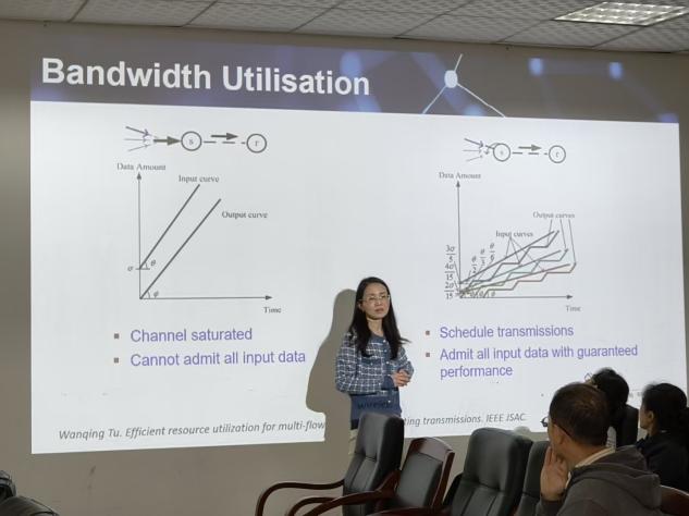 During the lecture, Professor Tu focused on network data transmission scheduling, emphasizing that efficient communication hinges on maintaining a sustained data output rate higher than the inputrate—otherwise, the system risks stagnation. Addressing network congestion, she proposed a “packet scheduling” strategy, vividly comparing it to managing passenger flow through separate queues atsubway stations. This approach sacrifices minor short-term delays toachieve significant overall throughput improvements, offering novelinsights for alleviating data transmission pressure.
