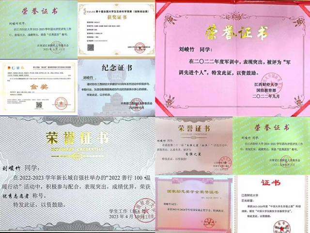 刘峻竹,女,共青团员,软件与物联网工程学院物联网工程221班学生。曾任校团委学生会办公室骨干、学院基层团组织建设部门骨干。曾获国家励志奖学金、江西财经大学自强之星、优秀团员、优秀学生等荣誉。获第十四届“挑战杯”中国大学生创业计划竞赛金奖、第十九届“挑战杯”江西省大学生课外学术科技作品竞赛一等奖,参与国家级大创一项并顺利结题。