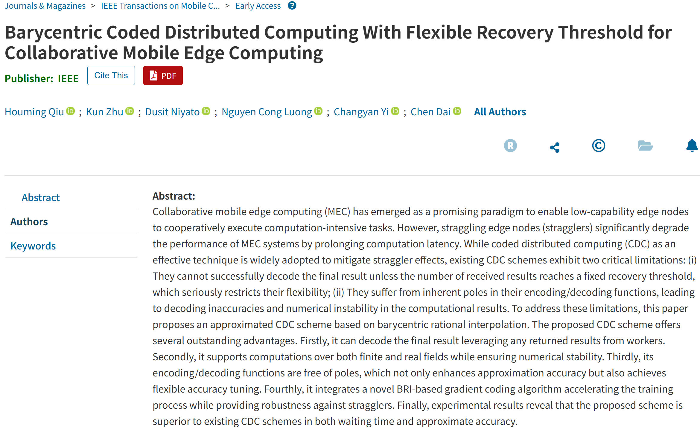 Recently,Dr. Houming Qiu, a young teacher from the School of Software and Internet of Things Engineering, published a research paper titled “Barycentric Coded Distributed Computing With Flexible Recovery Threshold for Collaborative Mobile Edge Computing” in the prestigious international journal IEEE Transactions on Mobile Computing (IEEETMC).This work proposes a Barycentric Rational Interpolation–based coded distributed computing scheme with a flexible recovery threshold (BRIcode). The BRI code is designed for collaborative mobile edge computing scenarios and enables a coded computation scheme with aflexible recovery threshold, which significantly improves decoding efficiency and substantially enhances the system’s resilience to straggling nodes.