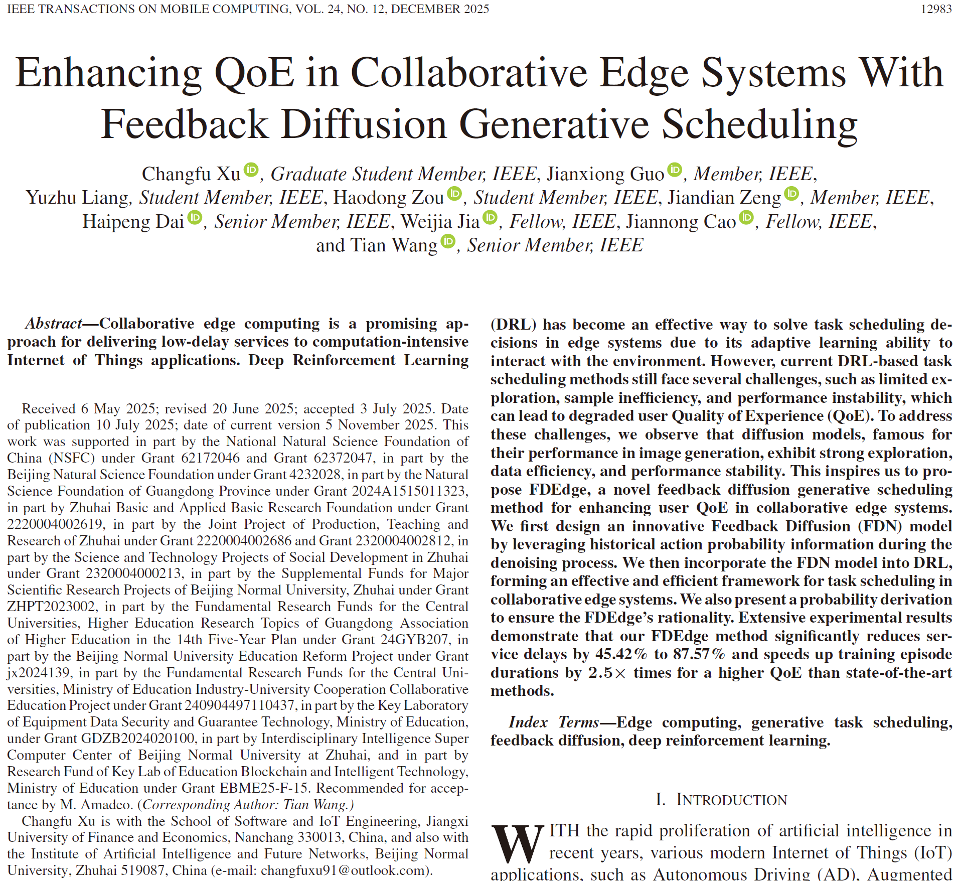 Recently, Xu Changfu, a young teacher from the School of Software and IoT Engineering, published aresearch papertitled "EnhancingQoE in Collaborative Edge Systems with Feedback DiffusionGenerativeScheduling" in the top international journal in the field of mobile computing,IEEE Transactions on Mobile Computing.The paper lists Dr. Xu Changfu as the first author, with collaborators including Professor Jia Weijia, Professor Wang Tian,Associate Professor Guo Jianxiong, Dr. Zeng Jiandian, and Dr. LiangYuzhu from Beijing Normal University, as well as Professor CaoJiannong from Hong Kong Poly technic University, Professor Dai Haipengfrom Nanjing University, and Dr. Zou Haodong from Anhui University.