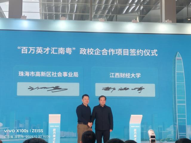 期间,袁红林出席了“百万英才汇南粤”大型综合招聘会开场仪式,并接受深圳卫视、珠海电视台等媒体专访,围绕学校人才培养特色、毕业生就业核心优势及校企合作发展愿景等议题系统分享,强调学校将持续主动对接粤港澳大湾区产业发展需求,为区域经济高质量发展输送更多“信敏廉毅”高素质财经人才。郭海峰代表学校与珠海市高新区社会事业局签订了合作协议。