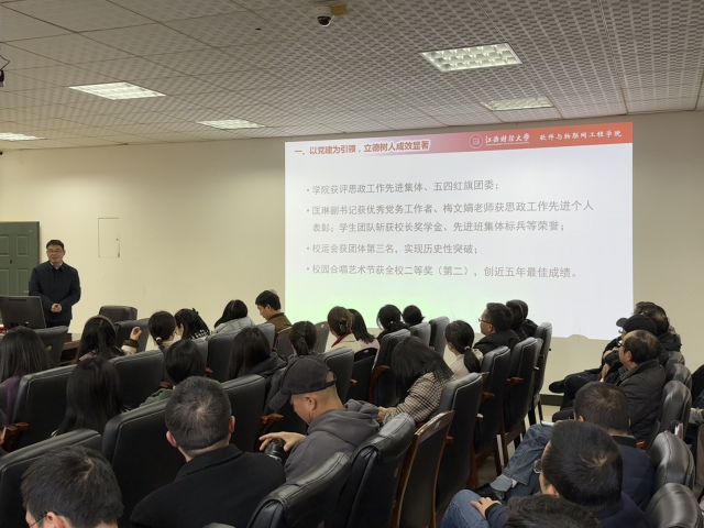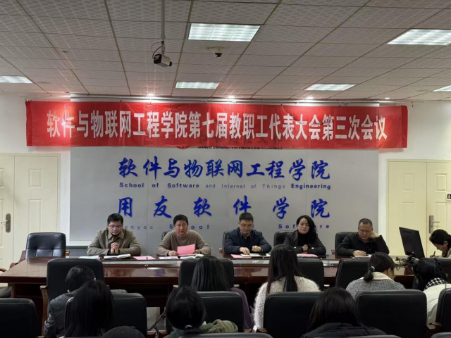 1月15日下午,软件与物联网工程学院第七届教职工代表大会第三次会议暨2025年度总结表彰大会在学院二楼会议室召开。学院全体领导班子成员、全体教职工及退休教师代表参会,共商学院发展规划,总结年度工作成效。会议由学院党委副书记匡琳主持。