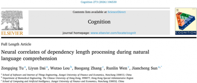 近日,软件与物联网工程学院在自然语言理解与认知神经科学交叉领域取得新进展,相关成果《Neural correlates of dependency length processing during natural language comprehension》发表于认知科学领域重要国际期刊《Cognition》(学校A类刊物)。该论文第一作者为硕士生涂宗晴,香港中文大学娄武涛博士参与合作,软件学院孙建成教授为通讯作者。